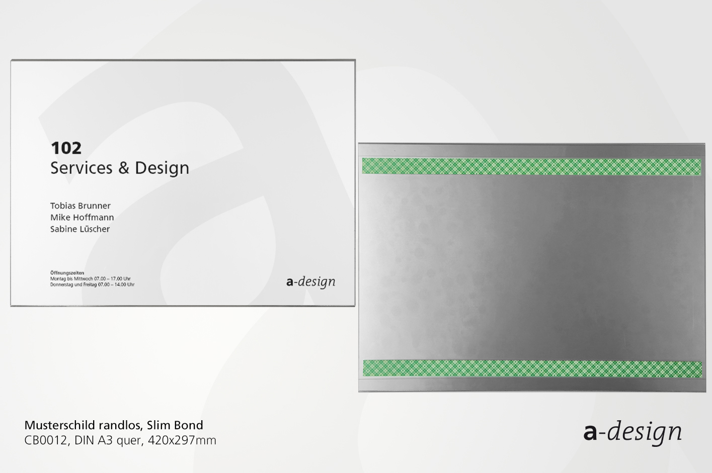 Mit unserem A-Design®Organizer oder der kostenlosen A-Design®Office Software haben Sie die Möglichkeit, Ihre Papiereinlagen individuell nach Ihrem Corporate Design zu gestalten und auszudrucken. Dies ermöglicht eine nahtlose Integration Ihrer Beschilderung in das Gesamtbild Ihrer Einrichtung.