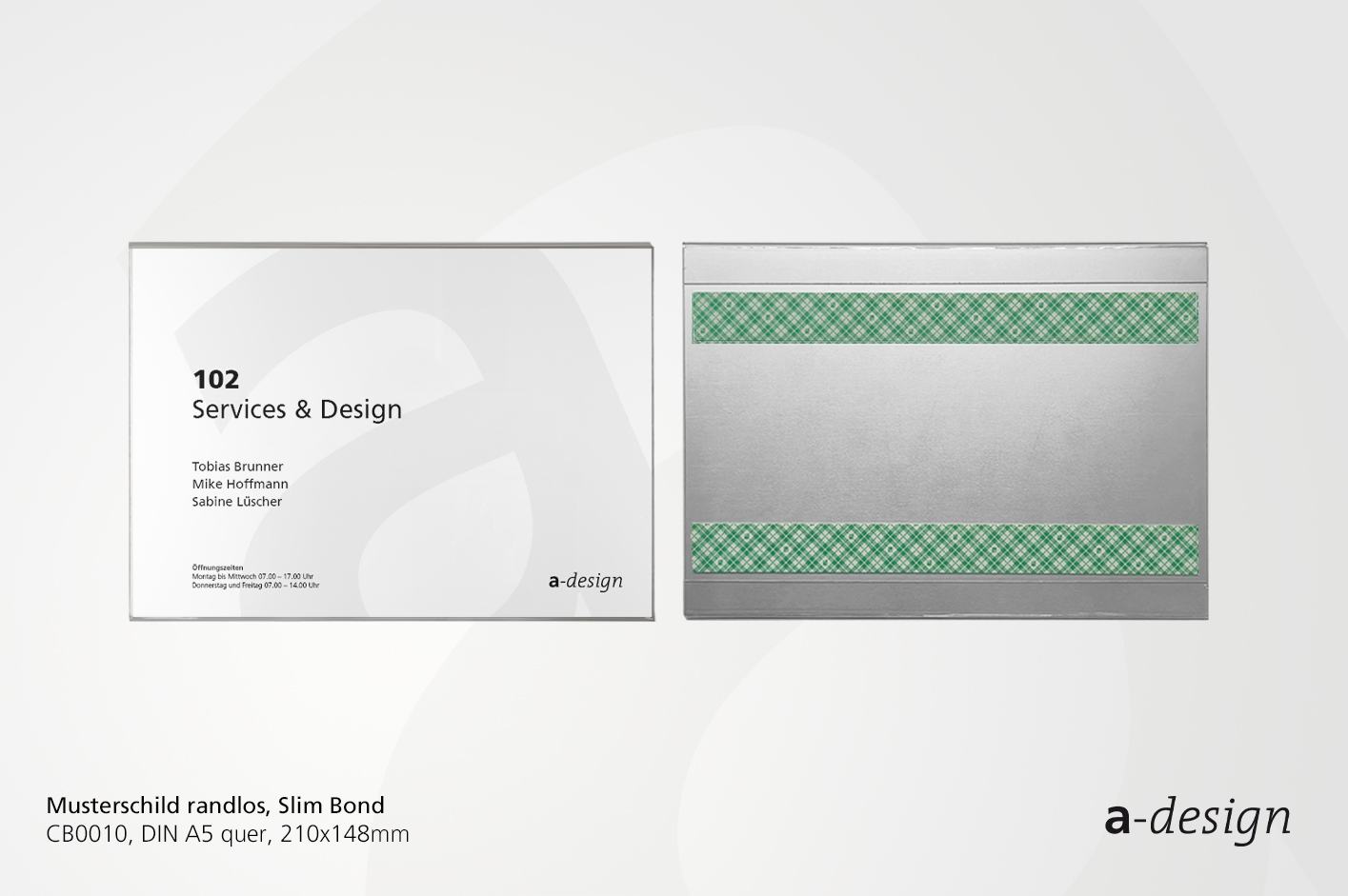 Die Slim Bond Schilder zeichnen sich durch ihre breite Einsatzmöglichkeit aus, von Raum- und Türbeschilderungen bis hin zu Wegweisern, Stundenplänen und Fluchtweghinweisen. Ihre Vielseitigkeit macht sie zur idealen Wahl für eine Vielzahl von Umgebungen, einschliesslich Büros, öffentlichen Gebäuden, Schulen, Hotels und weiteren Einrichtungen, wodurch sie eine umfassende Lösung für Beschilderungsbedürfnisse bieten.