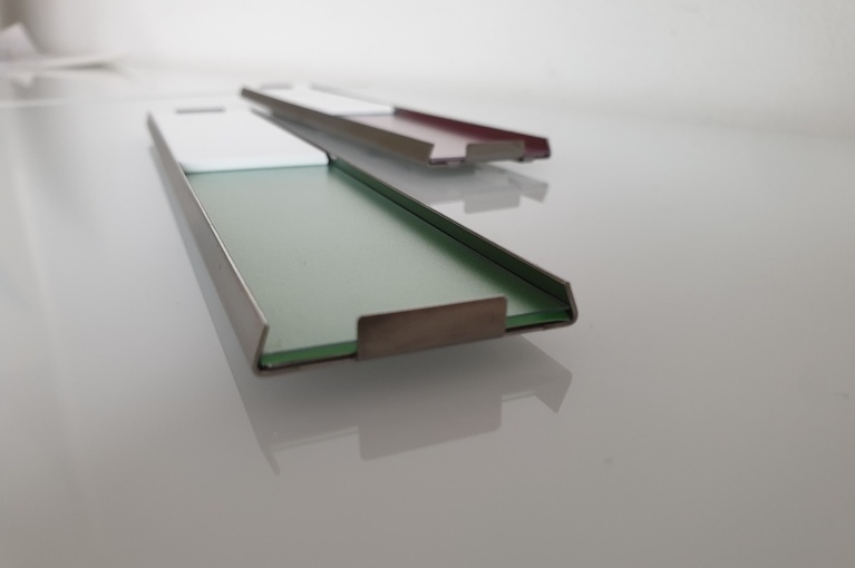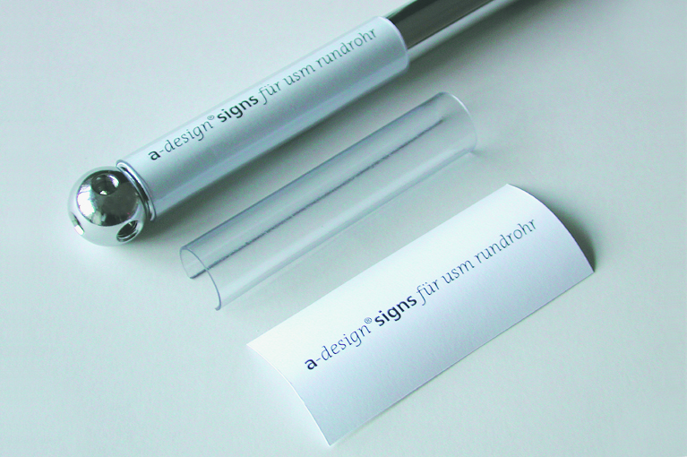 Eine abgerundete, transparente Hülle zum direkten und sicheren Aufklemmen auf USM-Möbelrohre. Perfekt für die flexible Beschriftung von Papier, Fotos oder Folien. Erhältlich in den Grössen 52,5 mm und 105 mm.