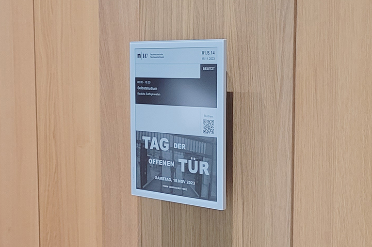 Mit ihrem hochwertigen Erscheinungsbild und frei gestaltbarem Screendesign passen sich unsere digitalen Beschriftungslösungen perfekt an unterschiedliche architektonische Umgebungen an. Individuelle Layouts, Farben, Logos oder Raumnamen können flexibel integriert werden – für eine konsistente und professionelle Informationsvermittlung.