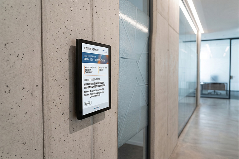 Unsere Lösungen lassen sich unkompliziert per LAN, WLAN oder PoE integrieren und ermöglichen eine zentrale Inhaltsverwaltung über den A-Design®Organizer. Inhalte wie Raumbelegungen oder Veranstaltungen werden automatisch über bestehende Buchungssysteme aktualisiert – spontane Reservierungen sind ebenso möglich.