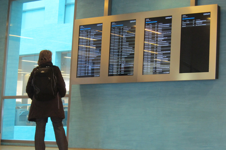 Die automatischen Beschriftungen von Reservierungssystemen oder Facility Management Software werden mühelos auf den Anzeigen zum Leben erweckt. Die im A-Design®Organizer gespeicherten Daten werden nach festgelegten Anzeigeregeln verarbeitet, die nicht nur die grafische Gestaltung, sondern auch die zeitliche und räumliche Präsentation der Informationen steuern. Durch die Implementierung dieser dynamischen Anzeigeregeln werden ortsgebundene Wegweiser aktiviert, indem sie den Nutzern entlastende Orientierungshilfen bieten, einschliesslich Pfeile, die ihre Wege verdeutlichen.